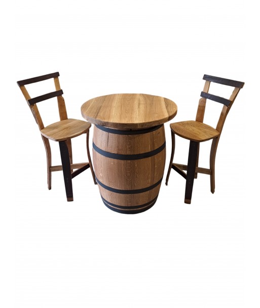 Degustační sud Bordeaux Natural v setu se stylovými barovými židlemi (aktuálně jsou naskladněny židle s jedním prknem v opěrné části) a masivní deskou.