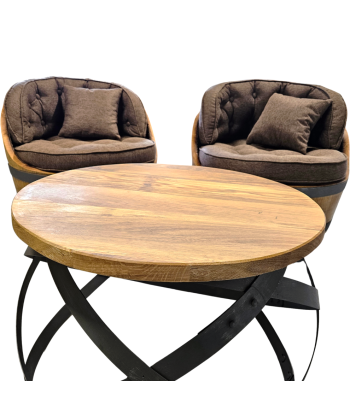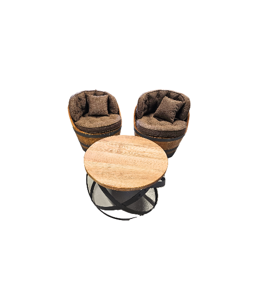 Dieses Möbelset aus einem Eichenfass passt gut in Ihren Keller, Ihre Weinbar, Ihr Pub oder eine gemütliche Weinecke in Ihrem Zuhause. Es schafft eine angenehme Atmosphäre, wo immer Sie Originalität zeigen möchten. Der Stuhl ist aus Planken eines gebrauchten Fasses gefertigt und erzählt die Geschichte des Holzes, das einst Wein gereift hat. Es ist nicht nur ein Möbelstück; es ist Holz mit einer Seele, bereit, Freude in Ihren Raum zu bringen.