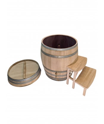 The barrel includes: wooden non-slip steps in the color of the barrel, a 3/4 brass outlet tap, a lid with a wooden handle.