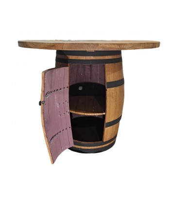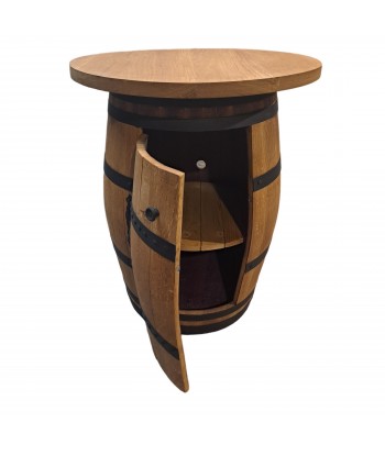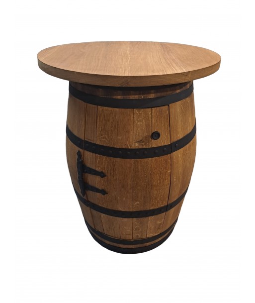 Bar keg with opening door. The door is fixed with decorative hinges and opens with a rustic metal handle. Inside the barrel is a wooden shelf. On the barrel is a solid oak plate with a diameter of 80 cm. The barrel is oil coated for long life. We recommend repeating the coating once a year. Can be used outdoors - direct rain must be avoided.